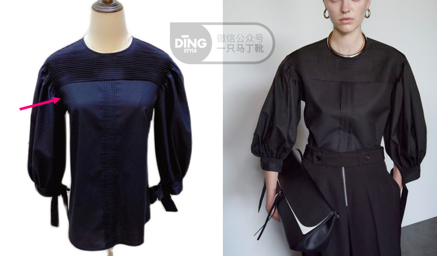 ▍ ② 颜色之间和谐吗? 不少淘宝店对配色不太讲究。比如下面两件大衣,款式很像,但为什么还是右边看起来舒服呢? 差别在于常常被忽略的纽扣,左边是死板的纯黑,个头还大,和整体的暖风格很突兀。右边混了米色,大小也更和谐。 之前还举例过这两条百褶裙,原版给人的感觉很柔和,仿版很生硬: 原版选了轻柔的浅鹅黄和浅水蓝,撞色却很清澈。仿版饱和度高,几个颜色都很不协调,还加了大面积灰色,暗沉很多。 随手翻翻,也能看到不少淘宝店把颜色搅在一起,打上「小众」「有设计感」的标签。 这种多色搭配,特别考验设计师的审美。如果你的预算还够不上偏繁复的设计,不如先从纯色买起。 ▍ ③ 这个纯色够美吗? 当然,纯色里也有不那么耐看的色调,还是需要好好筛选。 设计师们对颜色的要求有多高呢?之前看到我喜欢的品牌 Jil Sander 创始人的采访,发现她对黑色很执着,追求一种“ double black ”的效果。 因为她在德国北部城市汉堡,那里紫外线特别强烈。她发现很多所谓的黑色面料在强光下会褪色发白,变得斑斑点点,经不起细看。 ▲ 截取了其中一小段对话。 而“ double black ”更浓郁,不会因强光而褪色,这也是为什么引领极简主义的 Jil Sander 可以这么干净纯粹,简洁有力。 淘宝上也有一些店铺喜欢在标题写上“极简”“高级成衣”,但同样是羊毛裙,做出来的效果却差别很大: ▲ 一个对比。左边这条淘宝铅笔裙900块,日常光线下已经明显泛白了,显得质感粗糙。 还有的照抄 Jil Sander 的版型,价格也快四位数了,胸口上方却总有一长条不自然的反光: 对颜色高要求,在设计师里并不少见,Lemaire 也在采访里聊过自己的看法: