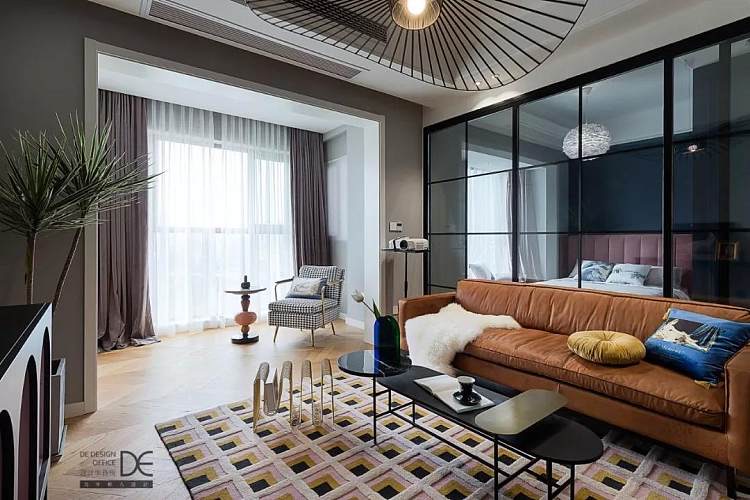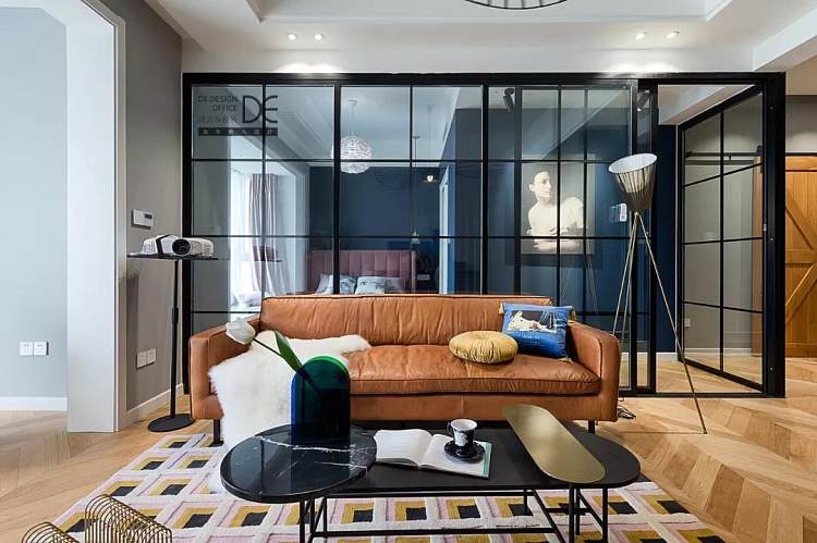 在重庆上学的95后姑娘,一个人坐拥80㎡的居住空间,还未大学毕业的她已经是个审美超棒的屋主。有了属于自己的家,在外生活打拼的她更有了属于自己的一份归属感,作为第一套房子,必然要装得精致个性,保证舒适的生活品质。 图源:DE设计事务 01基本情况和设计理念简介 80㎡(建筑面积,含有公摊),格局为一室一厅,每个空间面积分布都非常均匀,一个人住,空间非常宽松舒适。 ▲平面户型图 空间存在一些异形区域,难免存在一些缺陷,如下所示: ①橙色部分:因为格局不方正,导致入户处收纳空间不易布局,紧凑狭窄。 ②绿色部分:卫生间也不方正,面积损耗很大。 ③黄色部分:厨房内部格局虽然方正,但整体狭窄并紧邻卫生间门洞。 ④蓝色部分:客厅、卧室都有较大的采光窗户,不过整体不算敞亮。 ▲改造后方案图 结合屋主生活诉求和户型本身优劣势,DE设计师做了如下改造: ①优化门厅:拆除不方正的墙体,拓宽门厅餐厅空间。 ②厨房开放:厨房、餐厅连成一片,增强厨房使用舒适度,减少空间浪费。 ③洗漱分离:卫生间洗脸池外置,内部只做马桶区和淋浴房,完美规划空间。 ④空间借景:客厅、卧室墙体打通,替换成黑框玻璃隔断,增强采光,大气感倍增。 02色彩风格定位 全屋定义为混搭复古风,以浅灰色、复古木色、原木色、孔雀蓝为空间主色调,辅助色为棕皮色、黑色,冷暖结合提升空间层次对比,细节上点缀金属色提升精致感。 03餐厨空间 先说说鞋柜问题。(房屋位于楼层边角,门外角落处可外置鞋柜,存放少量常换的鞋子,利用起来,所以门厅也能更显宽敞,卫生更好打理。备用的鞋柜则设置在阳台,存放换季的鞋子) ▲入户餐厅 不担心鞋柜布置问题后,整个门厅空间纳入餐厅,拆除了一旁妨碍视线且浪费空间的斜面墙体,餐桌椅可以依附定制吧台摆放,视觉连贯性更好。 餐桌和摆台分别用到了纯白色和爵士白大理石打造,质感轻奢且打理方便,增设一组吧台椅极具休闲气息,进门也方便临时置放包袋等随手件。 餐厅左侧的过道墙面涂刷一整面墙的“孔雀蓝”涂料,呼应同色系的法兰绒餐椅,让色彩搭配更为连贯相互映衬。 利用细致的石膏线条在墙面装出层次丰富的腰线,更显复古格调。上方,利用圆形、方形、或粗或细的金属画框裱上复古装饰画,精致灵动,不规则的搭配映衬着年轻人心中的个性和创新。加上射灯的“洗墙效果”随手一拍堪比电影中精致画面。 ▲厨房 厨房外附带一个洗衣晾晒的小阳台,看了户型图大家都知道,之前的厨房非常狭窄。改造后如上图所示,整个厨房宽敞一倍。橱柜选择了灰色门板,整体造型偏向轻美式,装饰了简约的金色拉手和金色收纳架,倍显精致轻奢,地面采用深灰色仿古砖,色调层次鲜明、高级,整体又不突兀。 ▲自制的美食 虽然还未毕业,小姑娘已经非常独立了,平时但凡有空闲就会自己制作美食,好看又好吃,经常邀请同学来家中做客,几个闺蜜小聚一餐,生活简单幸福。 04客厅 ▲主空间 精致复古风搭配的好不好看,很大程度来源于设计师对装饰元素和色彩搭配的拿捏有度。在本案中,每一处的细节搭配都非常扣人心弦~ 鱼骨拼地板:为温润的木地板融入了更多复古元素,经典的鱼骨拼花更显档次感,同时这些许年代气息也让这个家更有文艺温馨气息。 撞色高脚电视柜:高脚柜本身造型复古大气,选择了外饰黑色内饰粉色的撞色款式,拱形门洞似乎划分出了一个一个精美的小盒子。年轻的女主人喜欢购买精致的小配饰,搭配其中完美融合反复一幅3D立体画,颇为灵动充满生趣。 铁艺草帽吊灯、真皮南瓜凳、黄白黑格子地毯,棕皮沙发,都是可以完美混搭的单品,组合在一起呈现出繁而不乱的丰富层次。让人眼前一亮,赏心悦目。精致不失大气,巧用跳色系,复古不失年轻范。 平时很少有时间看电视频道,偶尔晚上会有时间看看电影,于是安装了顶挂式投影幕布,平时不用的时候可以遥控隐藏,简约实用。右侧的休闲阳台打通并入室内,装饰了脏粉色的法兰绒窗帘,非常漂亮。一旁的白色隐形柜,内置换季的鞋子和清洁工具,不浪费空间。 白天,打开遮光帘,保留白纱帘,屋外的城市光景瞬间朦胧下来。休息日,不出门,慵懒的午后坐在千鸟格的单椅上喝杯冰镇饮料,或者阅读书籍,甚至可以盘坐发呆,放慢生活节奏,想想都觉得非常悠闲惬意。 考虑到原本客厅和卧室的采光有限,打通了沙发墙,用铁艺黑框玻璃隔断代替。整齐的黑色线条增添了一份复古韵味。家中除了女闺蜜和亲友,几乎不会有男性朋友过来。而平时更多的时间是一个人待在家里,不必过分担心隐私问题。 站在客厅看卧室,空间之间可以起到“借景作用”,视觉效果拓宽一倍。80㎡的一室一厅,也能装出复古豪宅范,虽然比不上真正的大户型,但是这宽敞通透的居住空间效果,丝毫不输采光优良的大户型。 女主人心心念念的衣帽间,设计师帮她实现了。在卧床右侧打造出一个单独的步入式衣帽间,更具休闲气息。用折叠百叶门隔开,减少空间占用更显灵动复古。墙面用到的孔雀蓝色调和床头的脏粉色进行撞色,对比鲜明,精致大方。冷静当中找到一丝俏皮可爱,很有品位。 衣帽间侧面装饰一幅复古油画,文艺气息超强。 将来可以根据自己的喜好和需求在玻璃隔断背后增设遮光窗帘。 05卫浴 一个人住,洗澡当然没有一家人频繁。考虑到通透感,卫生间内没有做淋浴房,后期根据需求可以增